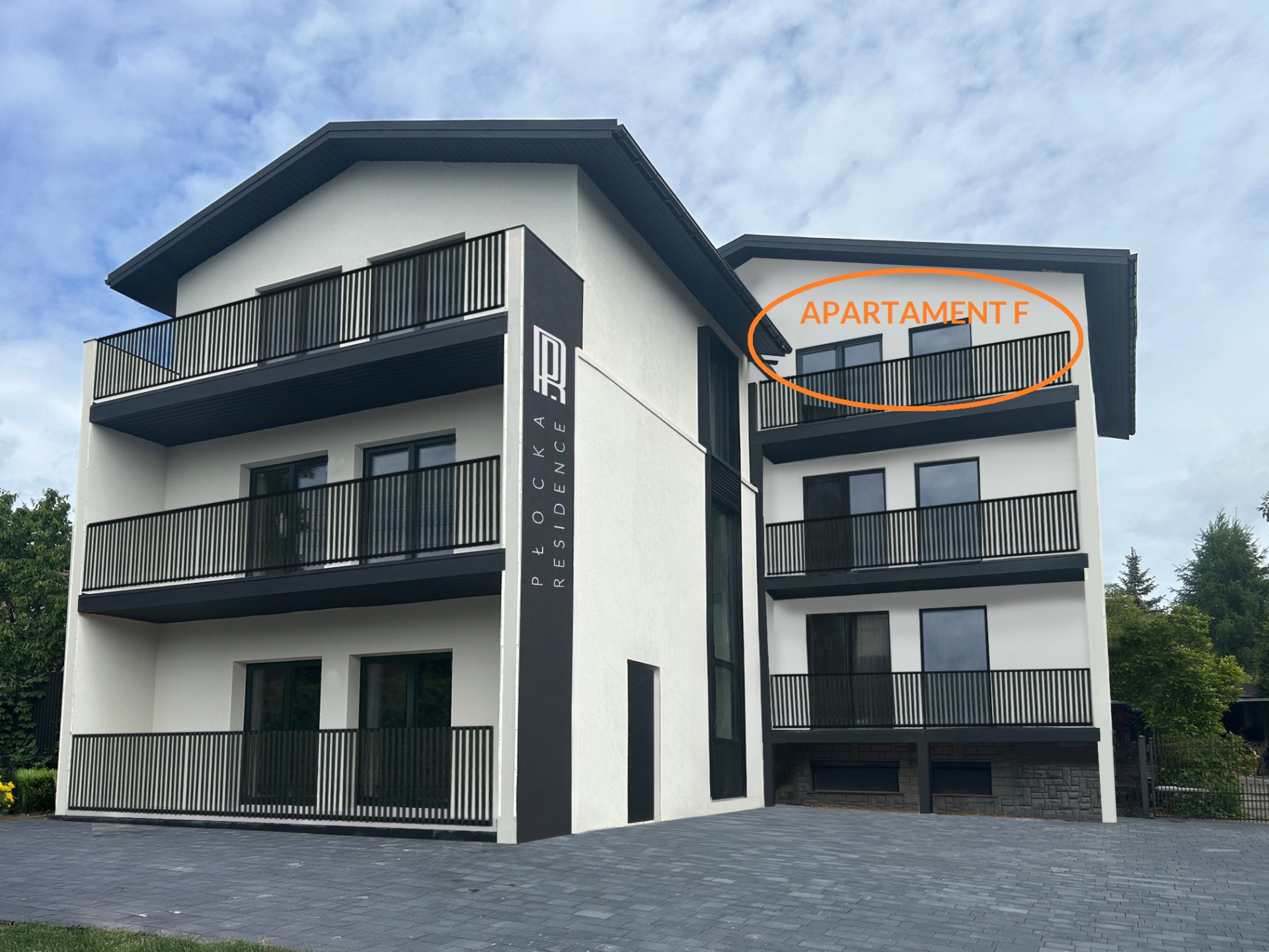Apartament F usytuowany jest na 2 piętrze. Wejście do mieszkania jest z klatki schodowej w budynku. Wejście do budynku znajduje się po lewej stronie.