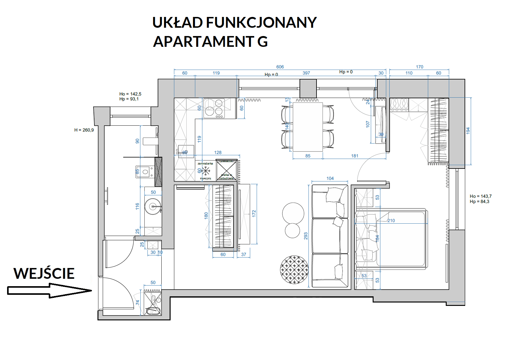 Apartament G usytuowany jest na 2 piętrze. Wejście do mieszkania jest z klatki schodowej w budynku. Wejście do budynku znajduje się po lewej stronie.